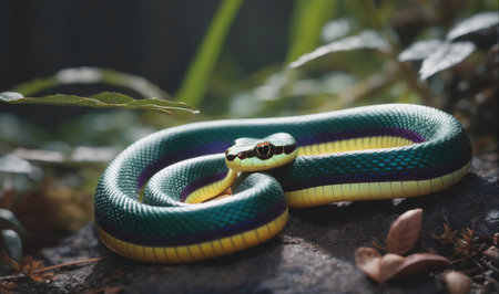 A green snake with a yellow stripe and purple markings is coiled on a rock in the forest
