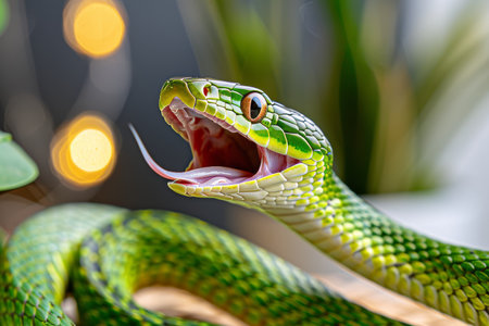 Close up of green snake with open mouth on warm background. The snakes playful expression adds a humorous touch