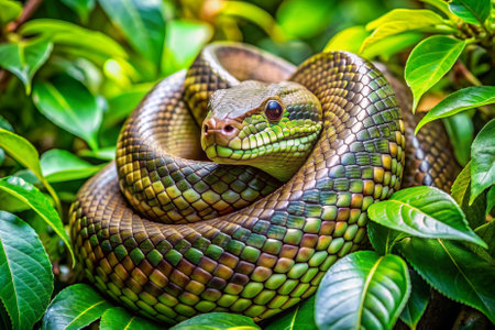 This close-up image captures a colorful snake resting among lush greenery, highlighting its intricate patterns and vibrant colors, showcasing the beauty of nature.