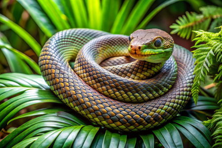 Green snake resting among lush leaves in a serene forest environment