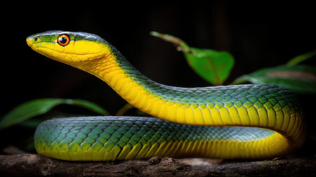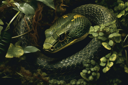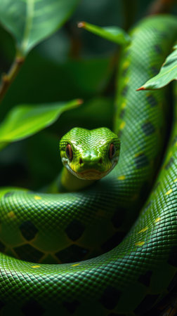 A green snake coiled among lush green leaves, blending seamlessly with its surroundings. The vivid green colors and the snake's intricate scales create a striking and captivating visual.