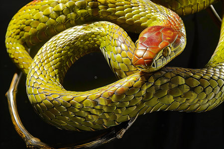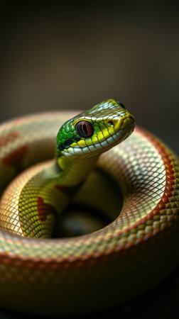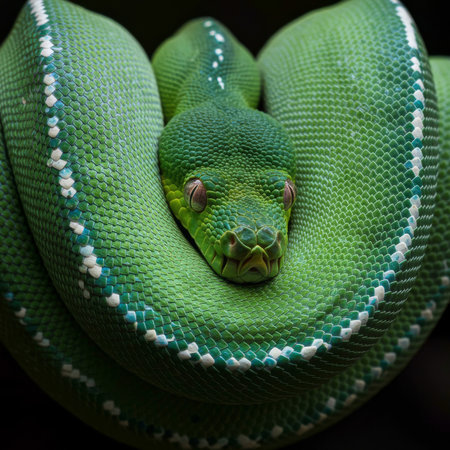 Bright green snake curled comfortably with intricate scales showing natural patterns and colors in a serene setting