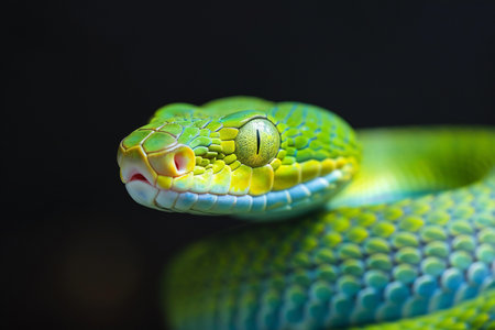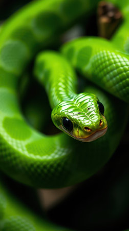 Bright green snake displaying intricate scale patterns against a contrasting dark background