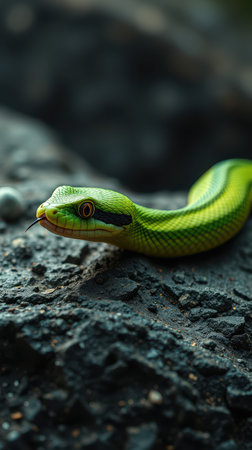 Bright green snake resting on dark rocks, showcasing vibrant colors and unique patterns in a natural habitat