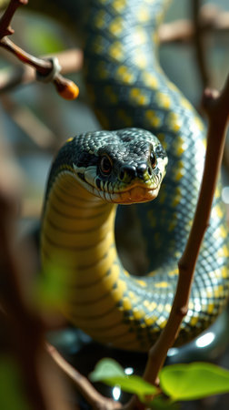 Colorful snake resting on branches while observing its surroundings in a natural habitat