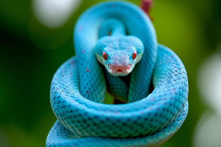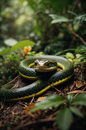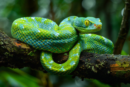 Green tree python resting among lush foliage in a tropical rainforest reflects natural beauty and vibrant colors