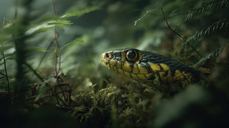An AI generated illustration of a green snake in the rainforest