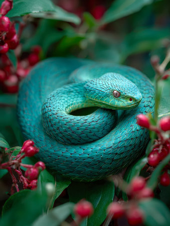 A striking turquoise serpent rests amid lush foliage and vivid crimson berries, showcasing detailed scales that enhance its mesmerizing appearance in a tranquil wood