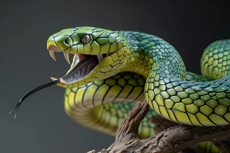 Fierce Green Viper Snake with Bifurcated Tongue Aggressively Attacking and Hissing in Lush Jungle or Forest Environment Dangerous Venomous Reptile Predator in Natural Habitat