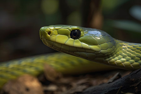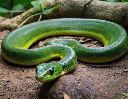 The image showcases a green snake majestically posed on the forest floor, highlighting its detailed scales and vibrant colors, perfectly blending with the natural setting on a sunny day.