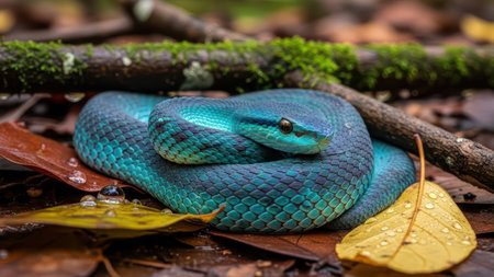 Vibrant blue viper resting on forest floor in autumn foliage.