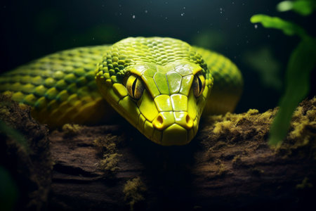 An AI illustration of An image of a vibrant green and yellow-colored snake perched on a rain-soaked tree log