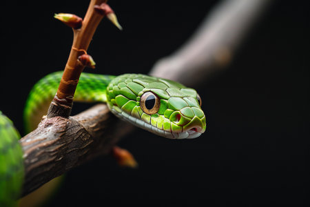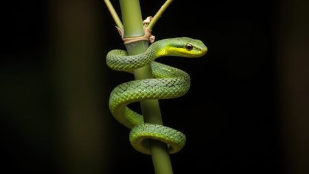 A striking green snake is coiled around a light brown bamboo branch, captured against a stark black backdrop. Its textured scales and piercing gaze are highlighted by the overhead lighting. The composition suggests a focused view of the snake, suitable for various editorial and commercial applications. The image showcases the beauty of nature.