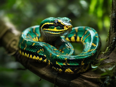 An AI illustration of A vibrant, green-colored snake with yellow spots is perched on a wooden branch in a lush, forest environment