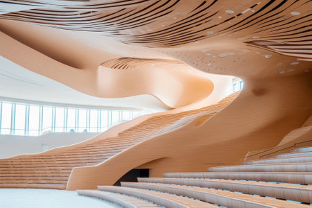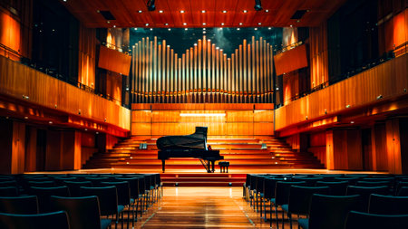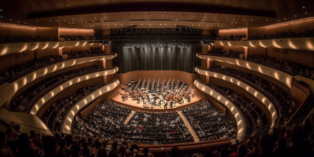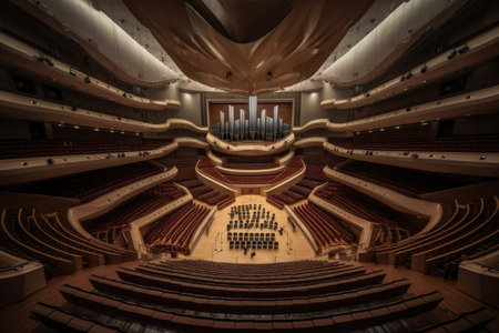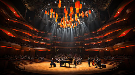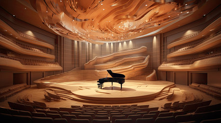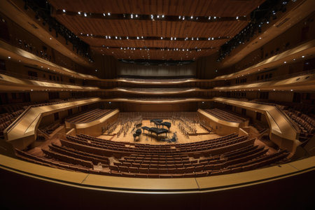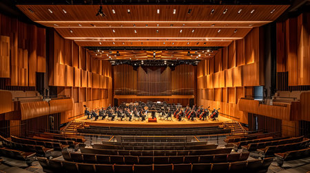 A breathtaking view of a modern concert hall showcasing elegant wood finishes and beautiful lighting, perfect for hosting various musical events and performances.