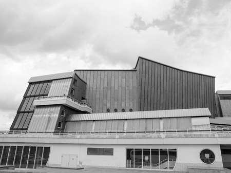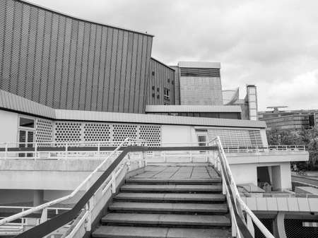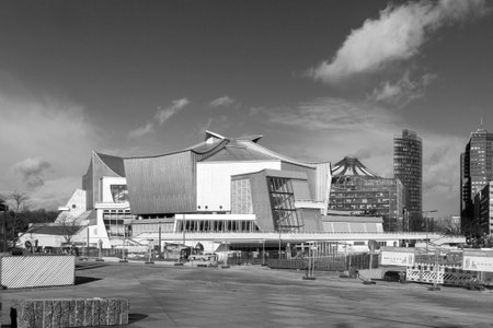 The Berliner Philarmonie concert hall in Berlin Germany in black and white