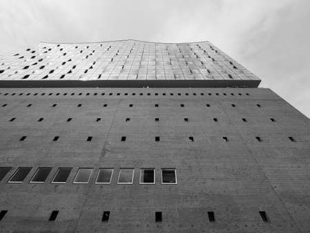 HAMBURG, GERMANY - CIRCA MAY 2017: Elbphilharmonie concert hall designed by Herzog and De Meuron in black and white