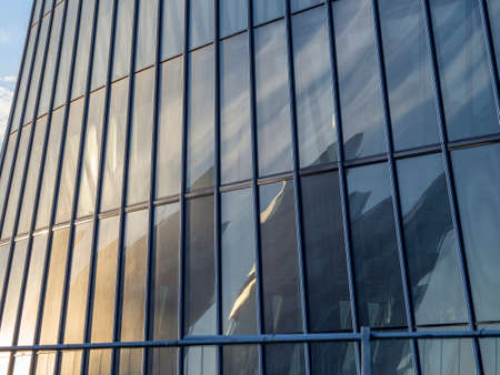 Horizontal shot abstract buildings with white metallic ribs and glass windows. Generative AI AIG21.
