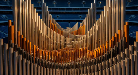 A massive and modern pipe organ dominates a large concert hall with its striking design of undulating silver and bronze pipes. The symmetrical, powerful instrument represents the grandeur of classical music and sophisticated acoustic architecture.