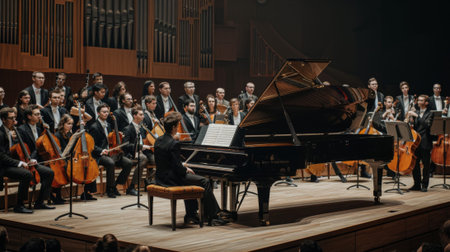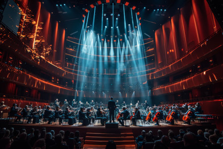 Symphonic orchestra performing classical music concert with professional musicians on stage