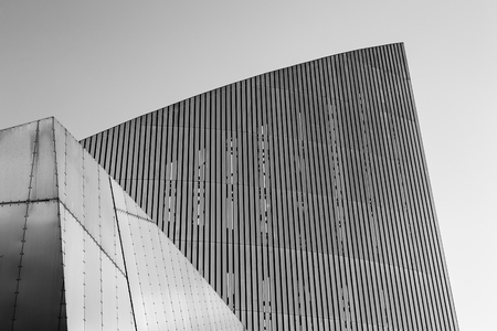 Monochrome image of two sections of the Imperial War Museum North, Manchester seen during the late autumn of 2017 from the riverside.
