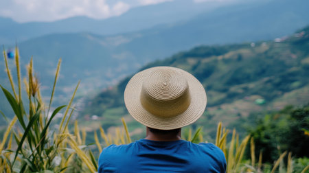 A serene moment captured as a man in a straw hat enjoys the breathtaking view of rolling green hills, highlighting the beauty of nature and rural life.