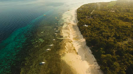 Aerial view of tropical beach on the island Bohol, Anda area, Philippines. Beautiful tropical island with sand beach, palm trees. Tropical landscape: beach with palm trees. Seascape: Ocean, sky, sea. Travel concept.