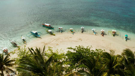 Aerial view of beautifulisland with white sand beach, Moalboal, boats, hotels and tourists. Tropical lagoon with turquoise water and white sand. Seascape: Ocean and beautiful beach paradise. Philippines, Cebu.Travel concept.