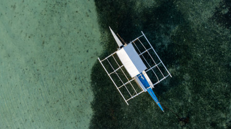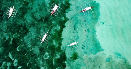 Aerial view of few fishing boats floating on the water in Bohol island, Philippines. Crystal clear water - transparent water.