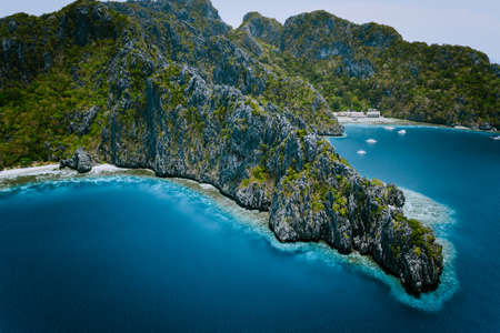 El Nido, Palawan, Philippines. Aerial view of Miniloc Island with diving boats above coral reef surrounded by karst limestone rugged mountain cliffs