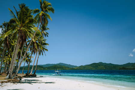 El Nido, Palawan, Philippines. Coconut palm trees on sandy beach and lonely filippino banca boat in turquoise ocean water. Island hopping tour with beautiful tropical scenery