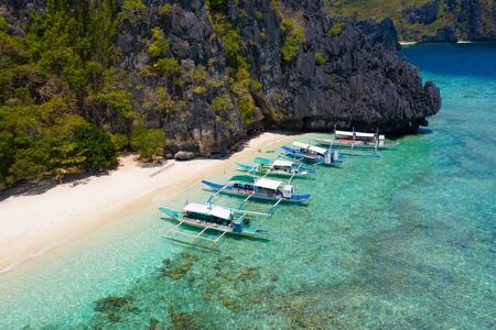 Many boats in the turquoise lagoon, view from above.Seascape with blue bay and boats. traditional Filipino wooden outrigger boat called a banca. Summer and travel vacation concept