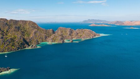 Tropical islands, aerial view. Aerial view: sea and the tropical islands. Tropical bay in El Nido. Archipelago El Nido.Sandy beaches of the wild islands. Philippines National Marine Park. Seascape: sky,clouds and mountains rocks,ocean. Sea landscape. Travel concept.