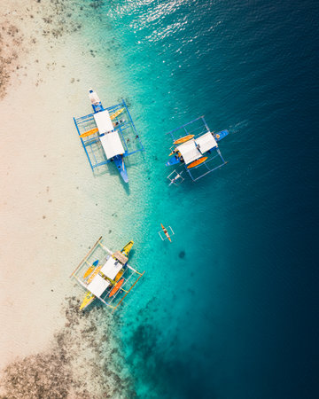 Passenger boats at shallow water of ocean bay top down aerial view. Cinematic summer vacation scenery of cruise on vessels at Philippines archipelago islands. Epic seascape with sun reflection