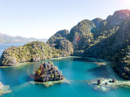 Aerial view: Lagoon with blue, azure water in the middle of small islands and rocks. Beach, tropical island, sea bay and lagoon, mountains with forest, Palawan, Coron. Busuanga. Seascape, tropical landscape. Philippines.