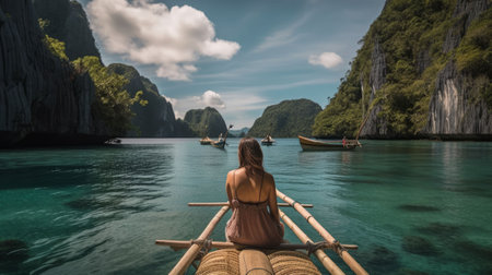 An AI generated illustration of a young woman wearing swimsuit enjoying sunny day on a boat in a tranquil body of water