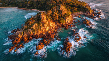 Aerial view of rocky island surrounded by turquoise waters and crashing waves, showcasing natural beauty of coastline and lush greenery. scene evokes sense of tranquility and adventure