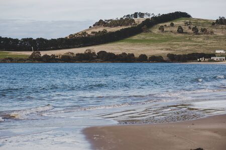 sunny Australian beach in Cremorne, Tasmania looking beautiful and deserted in winter