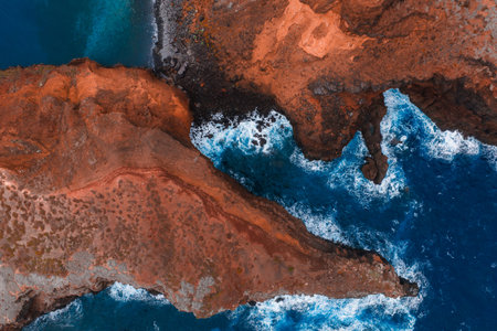 Generative AI : Aerial view of wild rock formation at shoreline in Isla de Lobos Canary Islands Spain