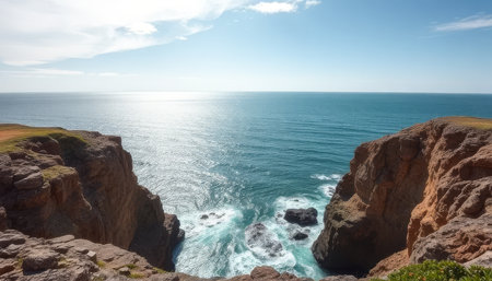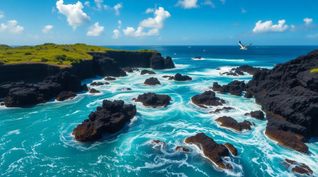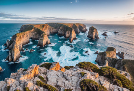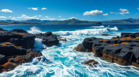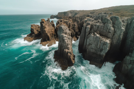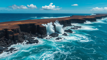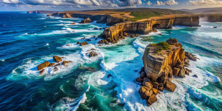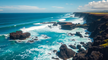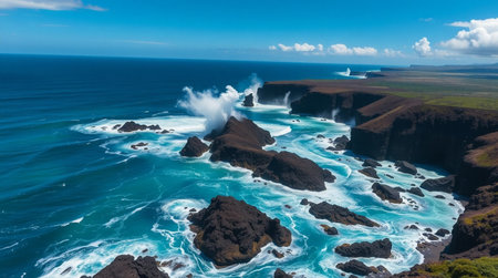 The rugged coastline is a symphony of crashing waves and jagged cliffs, where natures forces collide to create a breathtaking panorama of raw beauty.. AI generated.