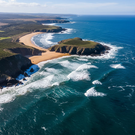 AI Generated. Aerial View of a Coastline with a Secluded Beach and Rugged Cliffs