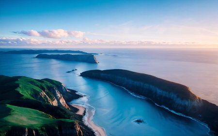 green mountains on the coastline of sao jie island, new zealand, bask in the warm sunshine. this stock photo, captured in the style of ricoh gr iii, showcases nostalgic landscapes reminiscent of nicolas delort's artwork. the atmospheric tonalities, inspired by kyffin williams, blend light blue and brown hues. the naturalistic ocean waves add to the serene beauty of the scene. ai generated