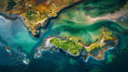 A breathtaking image ideal for travel brochures, nature documentaries, or geographic illustrations | This aerial shot offers a panoramic view of a serene, secluded cove, where the azure waves of the sea gently caress the rocky shore. The vibrant blues of the ocean provide a striking contrast to the lush greens of the grass-covered hills that curve around the shoreline, encapsulating the harmonious blend of terrestrial and marine ecosystems. The clarity of the water reveals submerged rocks near the surface, adding texture to the seascape, while the sun casts a soft, diffused light across the scene, emphasizing the peaceful atmosphere. This untouched natural sanctuary, with its clear division between sea, beach, and foliage, illustrates the diverse beauty of coastal regions and the tranquility they offer away from the bustle of urban life | Perfect for environmental campaigns promoting the preservation of natural habitats, as a stunning visual backdrop in relaxation and wellness settings, or incorporated into educational content to illustrate the delicate balance of coastal ecosystems. Additionally, it could serve as inspirational imagery for destination marketing or as an artistic representation of nature's quiet majesty for home décor | a serene aerial landscape of a coastal environment, highlighting the vibrant contrast between the blue sea and the green hills, with a gentle interplay of light and shadow under the afternoon sun, providing ample space for text or graphic additions