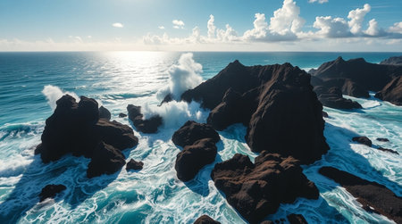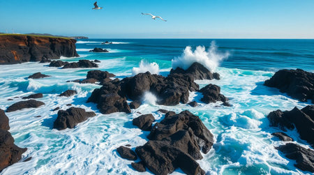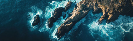 Aerial view of rugged coastline where powerful ocean waves dramatically crash against ancient rocks, creating a striking contrast with the deep blue waters.