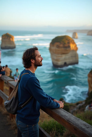 Handsome young man enjoying the view of the ocean and cliffs at sunset