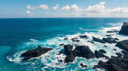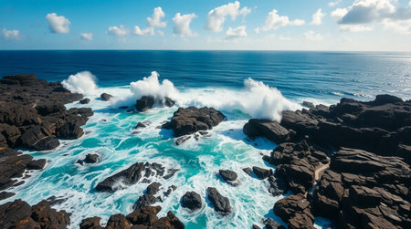 An aerial shot showcases a rugged coastline where vibrant turquoise waves surge against dark, textured rocks. The composition displays dynamic patterns of water and stone with overhead lighting. Suitable for environmental themes, it provides a visual for travel, nature, and coastal projects, offering versatile applications.