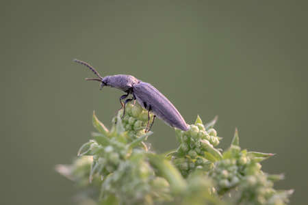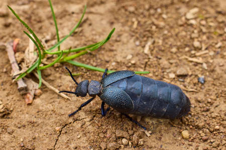 Closeup of violet oil beetle in natural environment. Meloe violaceus
