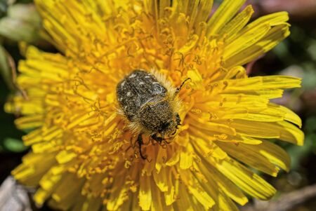 one big brown beetle collects pollen on a yellow dandelion flower bud in nature on a sunny spring day