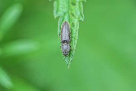 one small brown beetle sits on a green leaf of a wild plant in nature in a summer garden
