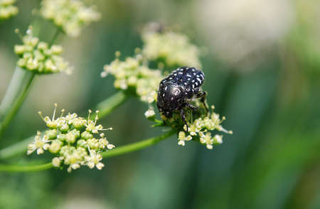 Mordellochroa abdominalis feeding on white flower, summer day, in a natural environment.